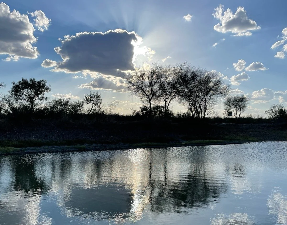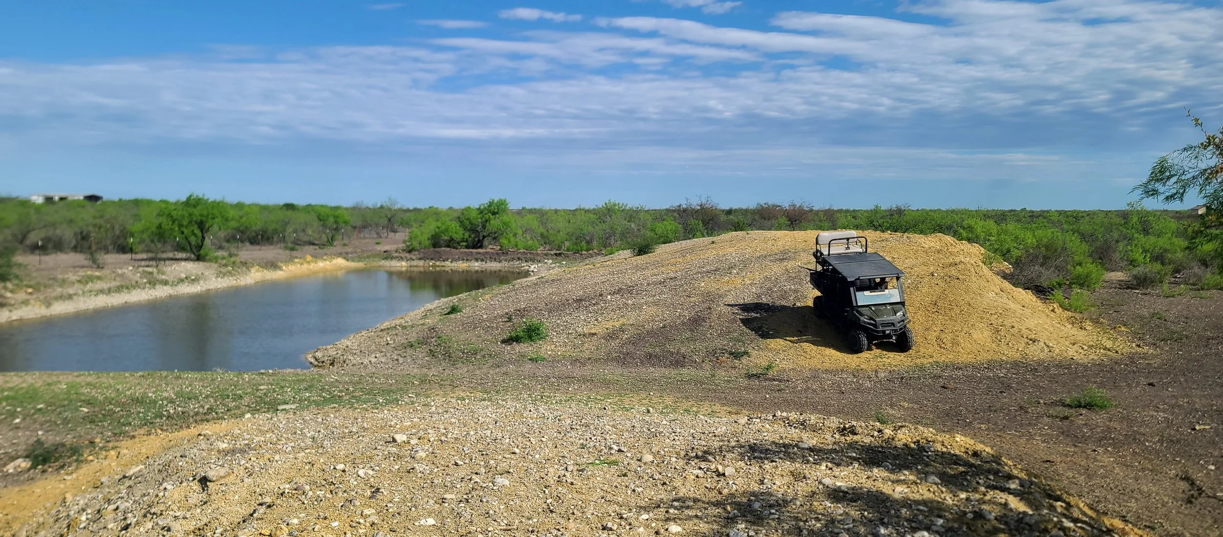 The Turtle Ranch sits on 60 acres that are high on the east and west ends, creating watershed for the greenbelt that runs through the middle. A few years ago, we hired Rodney, a skilled earth mover with almost 40 years experience to help us capture more water. To dig out acres of pond, Rodney built giant plateaus from the displaced dirt. From the top of each plateau, we can see not only the entire property, but some of the surrounding ranches.
