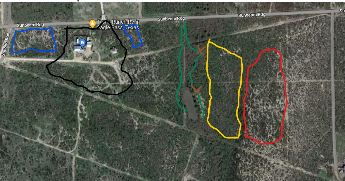 The green zone is the lowest point on the property, a green belt catching water from either side. The green zone is now a march larger pond that our tractor guy Rodney dug out years ago. Rodney, needing to displace the dug dirt, built a high pond wall, creating a plateau tall enough to see not only the entire ranch, but also the surrounding properties. Across a land bridge is an equivalent plateau formed from the original pond. The tan X’s mark the plateaus.